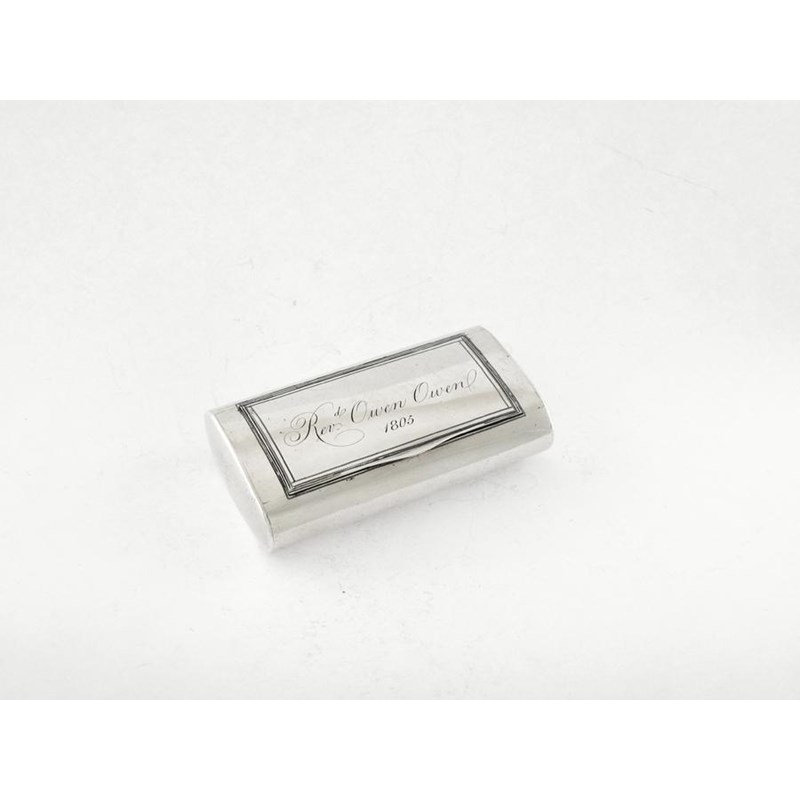 A George III rounded oblong snuff box, with a concealed hinge and an engraved thread border around the cover, inscribed "Revd. Owen Owen 1805", gilt interior, by James Barrett, London 1804, 3.2in (8.1cm) long, 2oz.