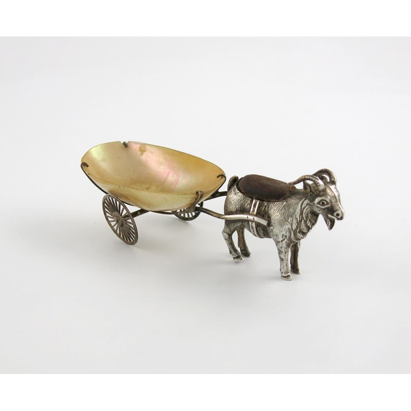 An Edwardian novelty silver billy goat and cart pin cushion,