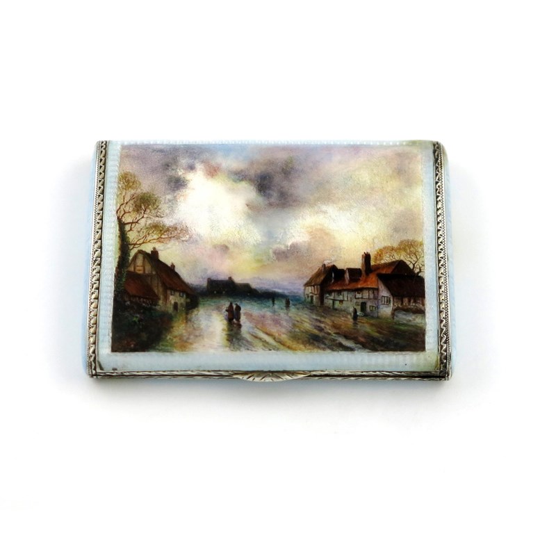 rectangular form, the hinged cover with a village scene, enamelled pearl coloured sides and base, gilded interior, length 8.3cm, approx. weight 4.4oz.