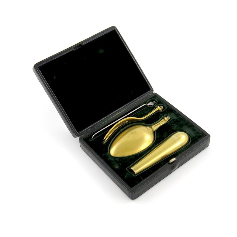 the three screw-in handles of canon form, the smallest one opens to reveal a corkscrew, in a fitted case, length of fork 15.8cm, approx. weighable 4oz.