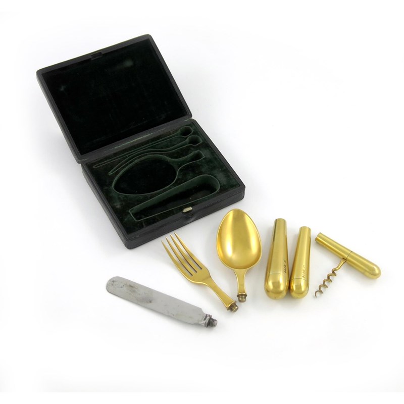 A Victorian travelling silver-gilt fork, knife and spoon set with a corkscrew,