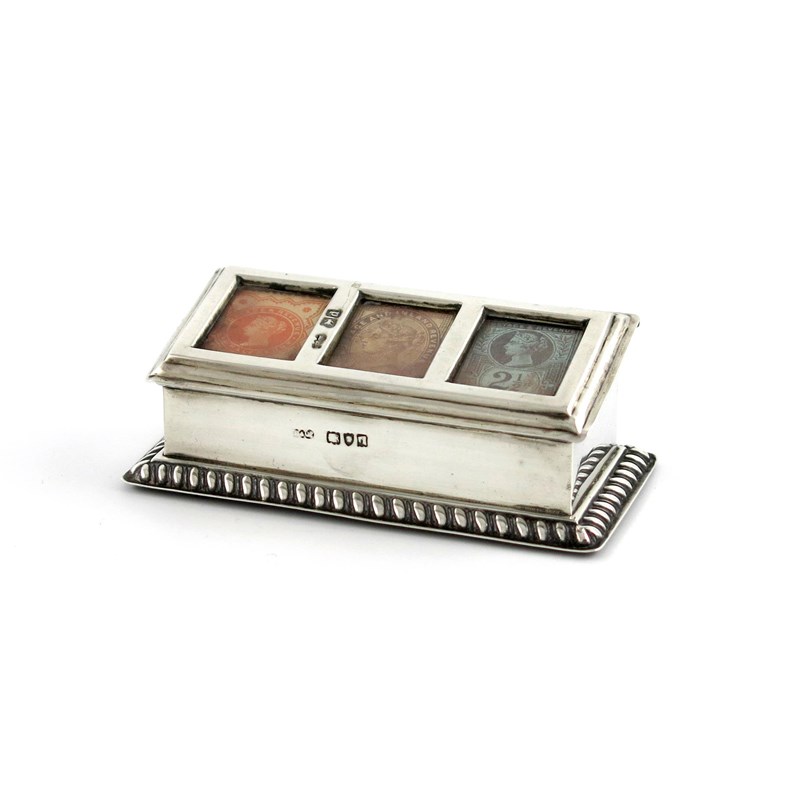 rectangular form, the sprung hinged cover with three stamps under glass, the gilded interior with three compartments, on a rectangular gadrooned base, length 9.3cm.