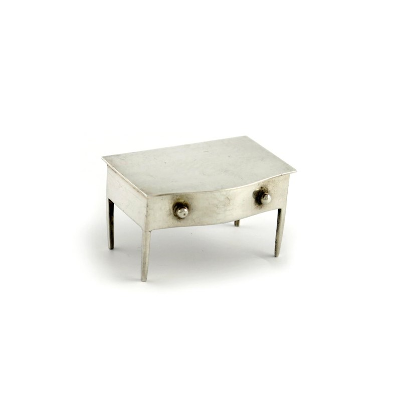 modelled as a lowboy, the hinged cover opens to reveal two compartments, the serpentine front with a dummy drawer, length 5.8cm, approx. weight 1.6oz.