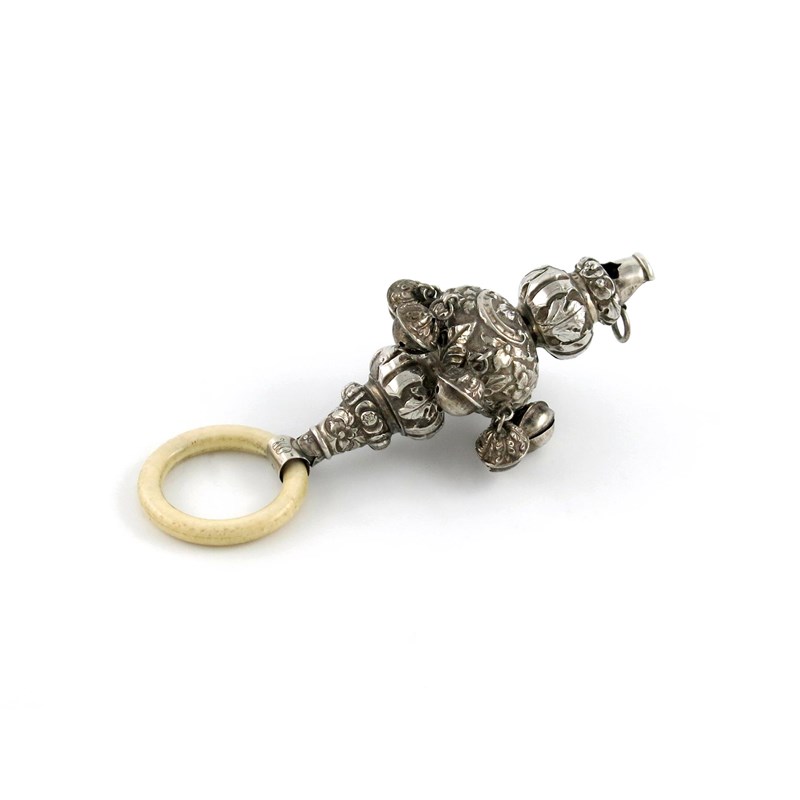 baluster form, embossed foliate scroll decoration, with seven bells and a ring attachment, with a later plastic teething ring, length 14.3cm.