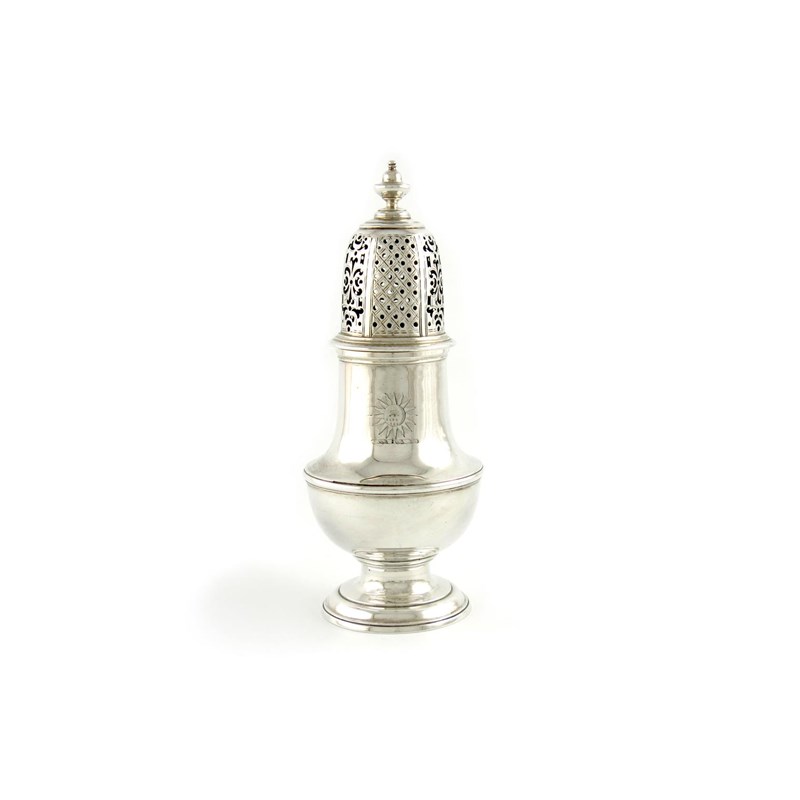 circular bellied form, the pull-off cover with pierced decoration and with a knop finial, engraved with a crest, on a raised circular foot, height 18.5cm, approx. weight 7.9oz.