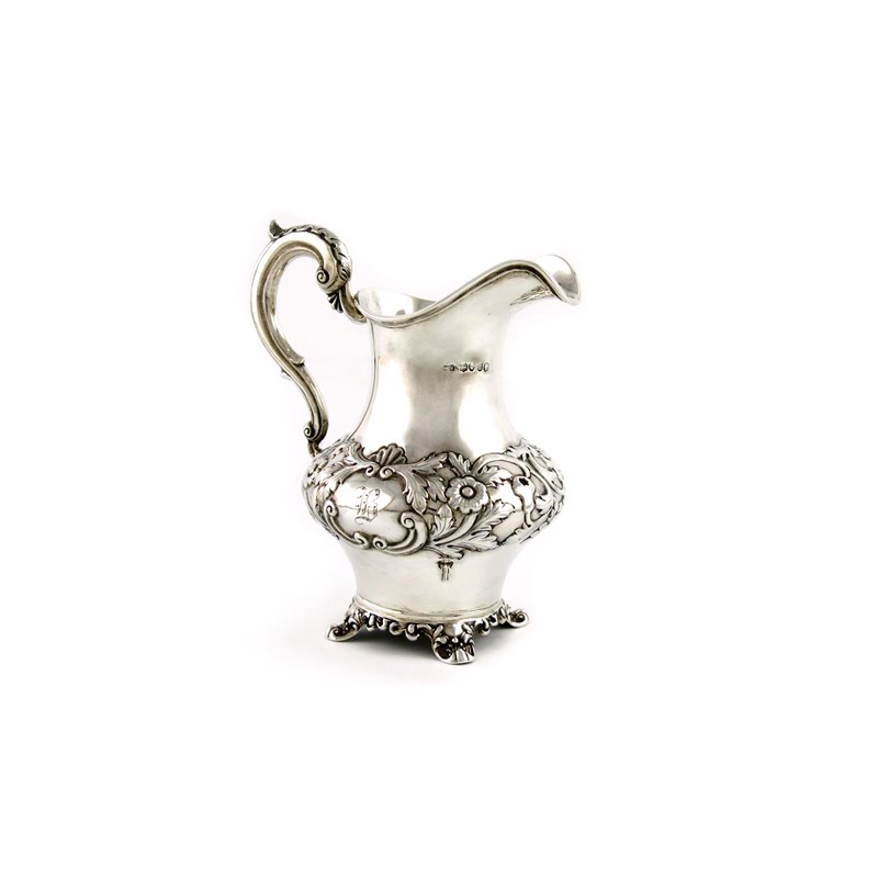 baluster form, embossed foliate scroll decoration, leaf capped scroll handle, on four scroll bracket feet, engraved with a crest, height 15.5cm, approx. weight 8.7oz.