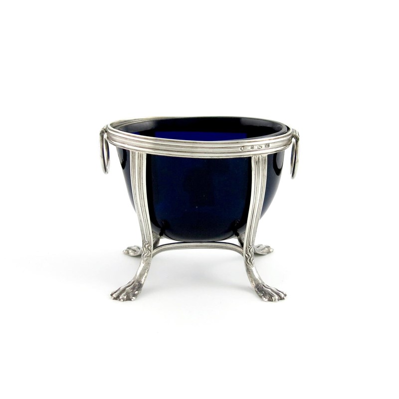 oval reeded wire-work form, drop ring handles, on four paw feet, with a blue glass liner, length 12cm, approx. weight 6.7oz.