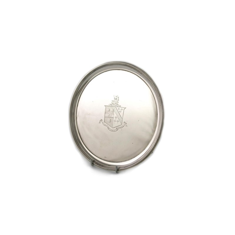 circular form, the centre engraved with an armorial shield, reeded border, on three bracket feet, diameter 20.5cm, approx. weight 13.5oz.