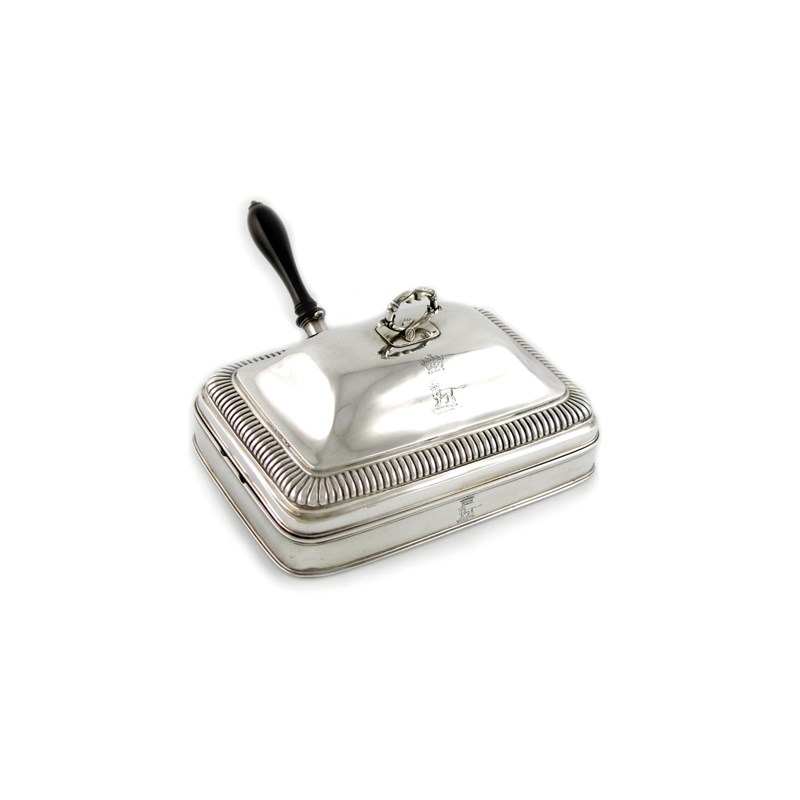 rounded rectangular form, domed hinged cover with a fluted border, foliate handle and engraved with a crowned crest, screw-out detachable turned wooden handle, length 24.2cm, approx. weight 40oz.