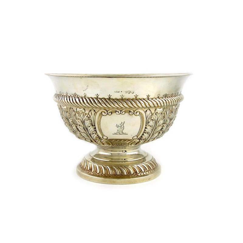 circular form, with embossed decoration, on a raised circular foot, engraved with a crest, diameter 24cm, approx. weight 23oz.