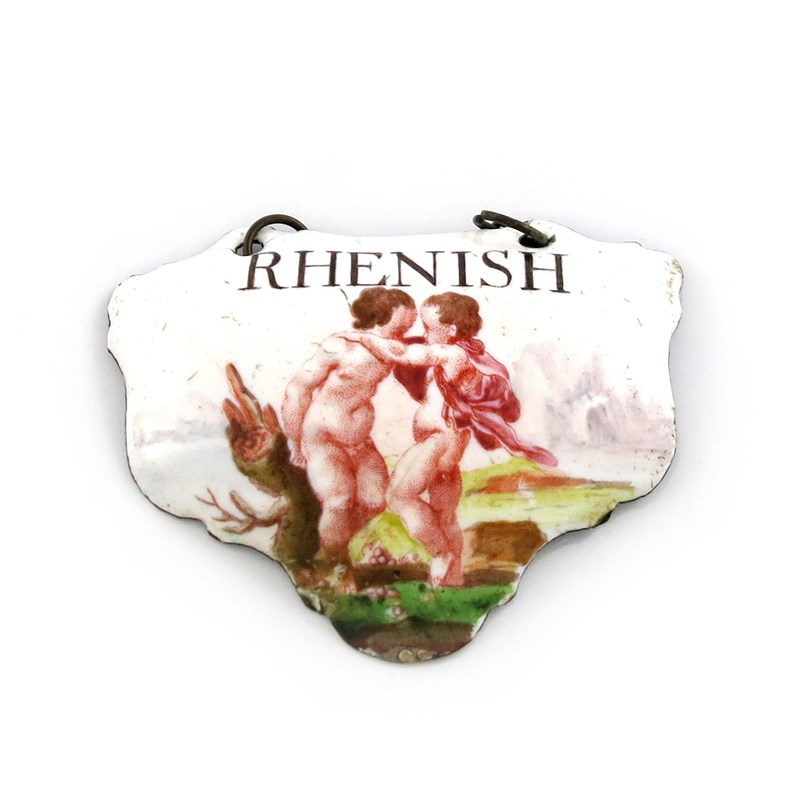 escutcheon form, with two cupids in a rocky landscape, titled 'RHENISH', length 6.7cm.