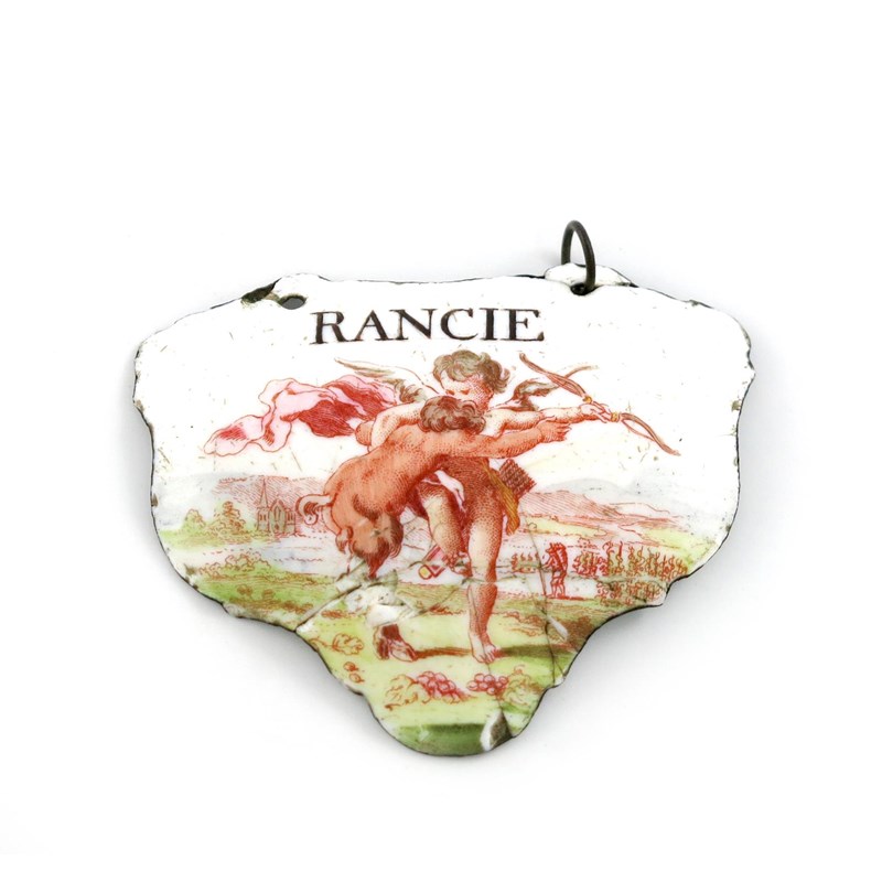 escutcheon form, with a wrestling cupid and satyr in a landscape, titled 'RANCIE', some chips, length 7.1cm.