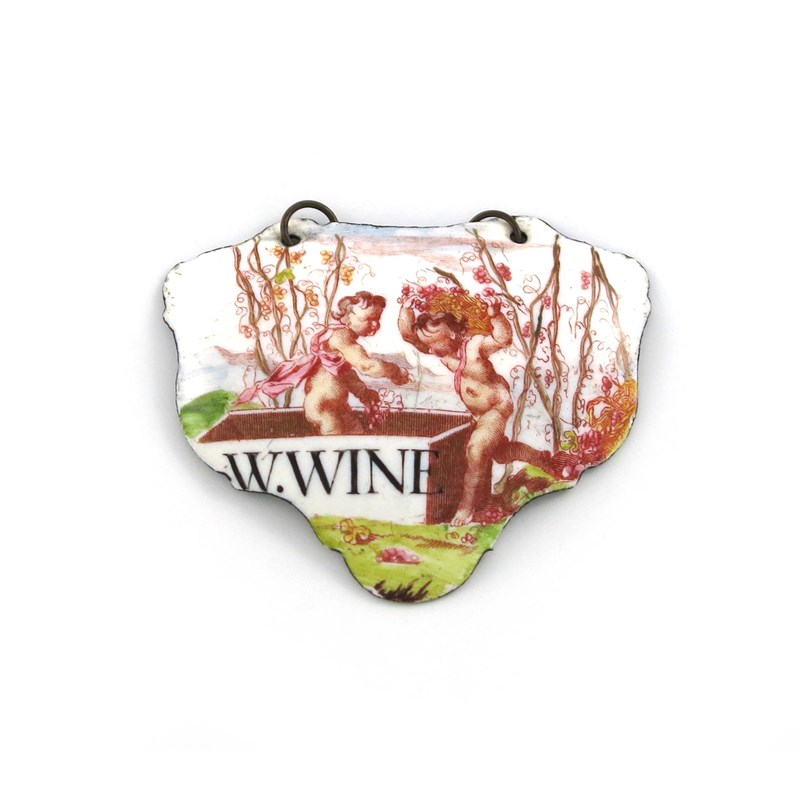 A rare mid 18th century Battersea enamel wine label