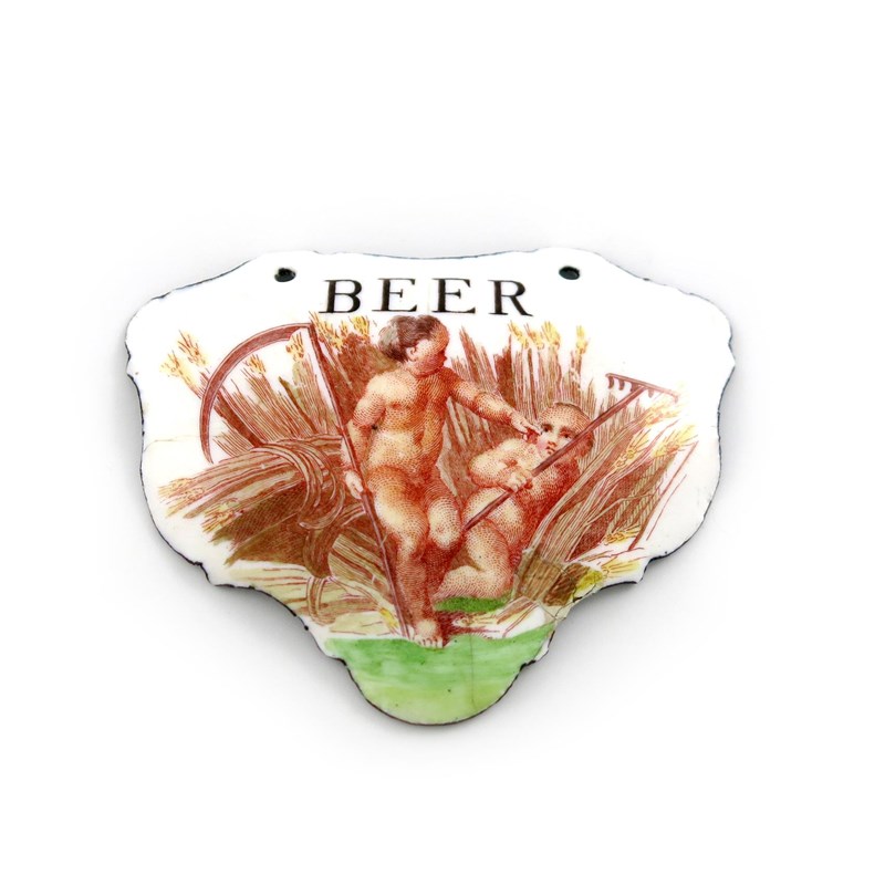 escutcheon form, with two cupids in a wheat field holding a scythe and rake, titled 'BEER', the reverse with labels 'English Ceramic Circle 1977, No.254', and Dr. Bernard Watney address label' and the label 'Tom Walford', length 7cm.
