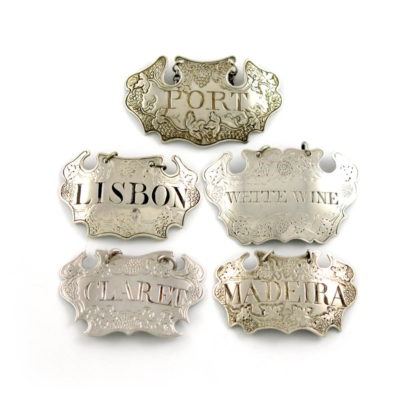 cartouche form, chased vine decoration, incised and blackened 'LISBON' and incised 'PORT', 'WHITE.WINE', 'MADEIRA' and 'CLARET', approx. weight 2oz. (5)