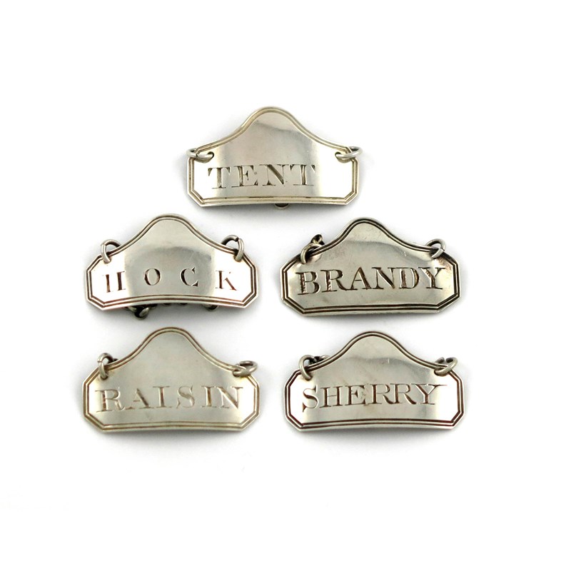 rectangular form, canted corners with a raised pediment, reeded borders, incised 'TENT', 'RAISIN', 'HOCK', 'BRANDY' and 'SHERRY', approx. weight 1oz. (5)