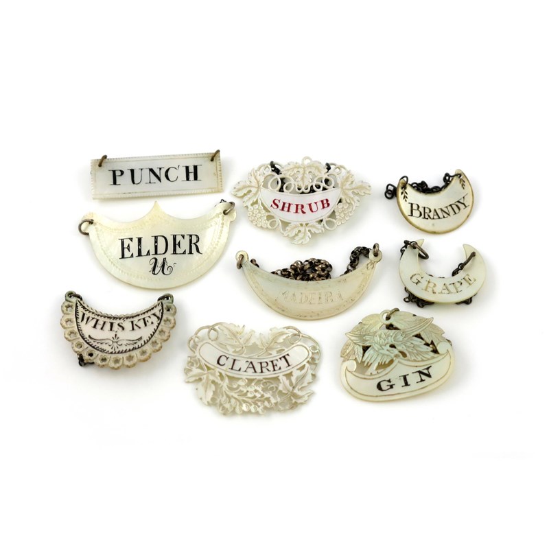 various designs, with pierced and engraved decoration, incised and blackened 'SHRUB', 'CLARET', 'PUNCH', 'GIN', 'ELDER', 'GRAPE', 'BRANDY', 'MADEIRA', and 'WHISKEY'. (9)