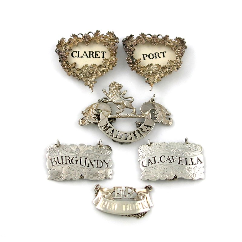 comprising one by L. A Crichton, London 1952, celebrating the Queen's coronation, incised 'RED HOCK', plus an armorial scroll label pierced 'MADEIRA', plus two pierced 'CALCAVELLA' and 'BURGUNDY', and two slot in labels, approx. weight 3oz. (6)
