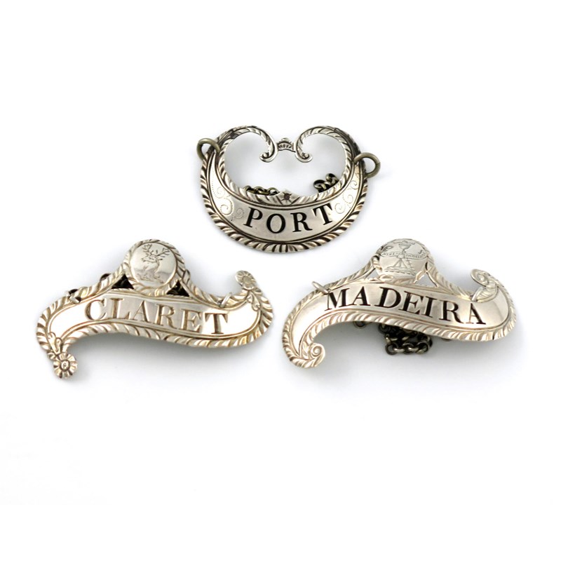 two of scroll form, feather-edge borders, with crested pediments, incised 'CLARET' and blackened 'MADEIRA', and another incised and blackened 'PORT', approx. weight 0.9oz. (3)
