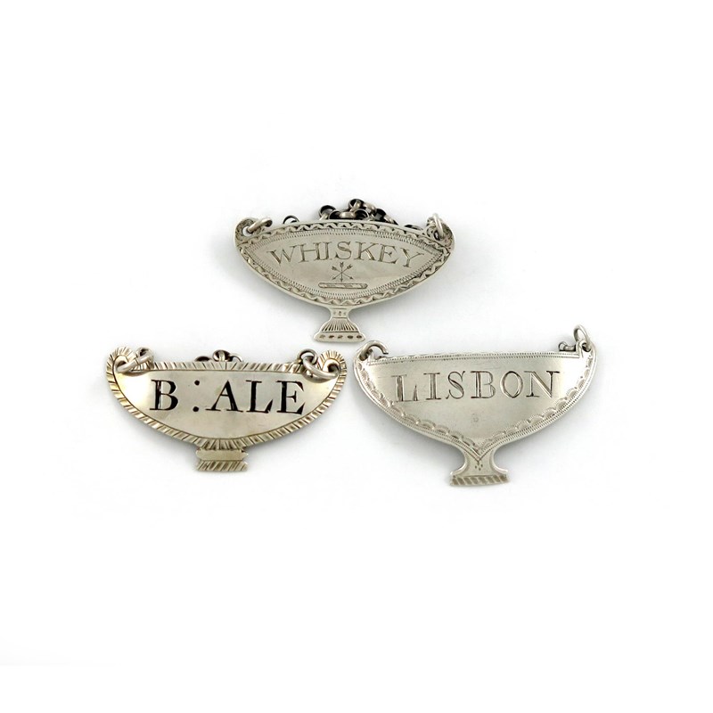 goblet form, bright-cut border, incised 'LISBON', plus another, by Samuel Pemberton, Birmingham 1805, bright-cut border, incised 'WHISKEY' above a crest, and an unmarked label, incised and blackened 'B: ALE', approx. weight 0.5oz. (3)