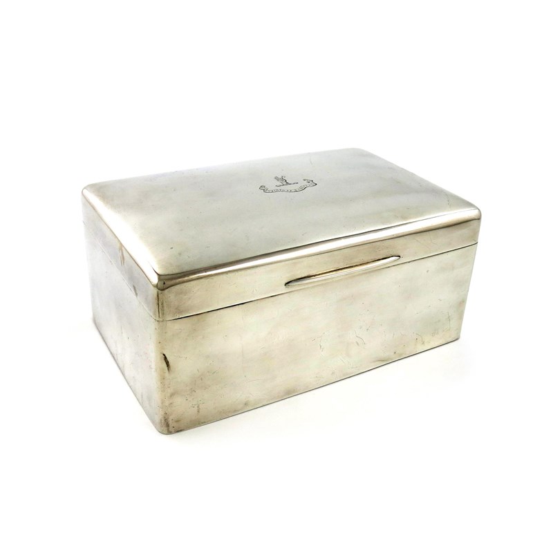 rectangular form, solid hinged cover engraved with a crest, the interior gilded, the base wood lined, length 25cm,