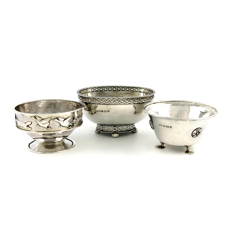 comprising: one of oval form, Birmingham 1930, spot-hammered decoration, interwoven plaited border and foot, on four ball feet, length 13cm, plus a circular bowl, Birmingham 1916, baluster form, spot-hammered decoration, with a border of running foxes chasing geese, on a spreading circular foot, diameter 10.1cm, and a tapering circular bowl, Birmingham 1924, spot-hammered decoration and applied with three floral motifs, on three pad feet, diameter 11.1cm, approx. weight 12.8oz. (3)