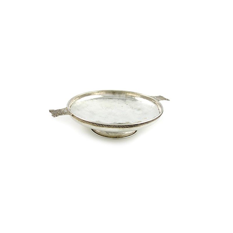 squat circular form, spot-hammered decoration, with a rope-twist border, two cast Tree of Life handles, on a raised tapering circular foot, diameter handle to handle 25cm, approx. weight 6.7oz.