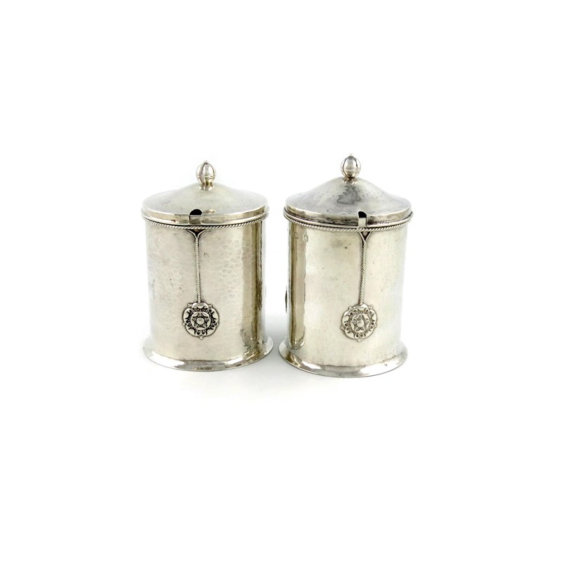 By A. E. Jones, a pair of Arts & Crafts silver jam pots,