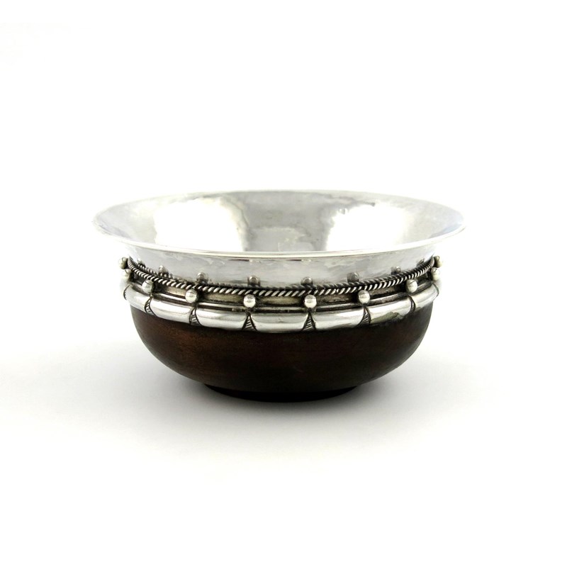 By A. E. Jones, an Arts & Crafts silver-mounted wooden mazer bowl,