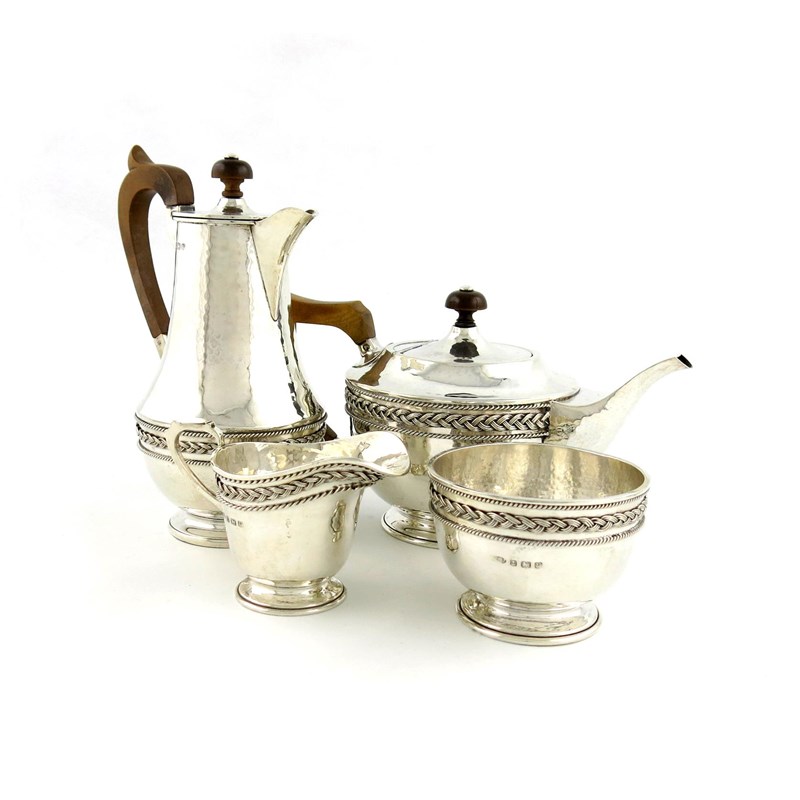 circular form, the tea pot, sugar basin and cream jug with an intertwined plaited and rope-twist border, the hot water pot with a similar girdle, spot-hammered decoration, on a raised circular foot, scroll handles, height of hot water pot 21.2cm, approx. weight 39.6cm. (4)
