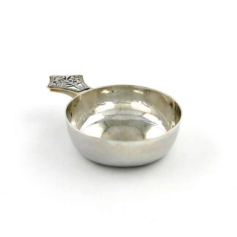circular bowl with spot-hammered decoration and pierced Tree of Life handle, diameter 8cm, approx. weight 3.3oz.