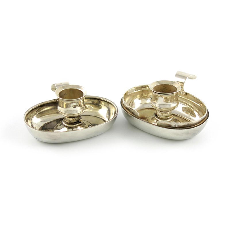 oval form, hinged scroll handles, hinged capitals, on oval bases that fit together, length 9.3cm, approx. weight 6.2oz. (2)