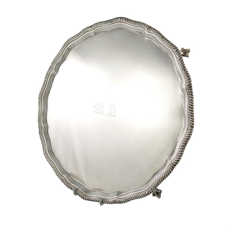 circular form, gadroon border, engraved with the Wynne Finch crests, on four claw and ball feet, diameter 30.8cm, approx. weight 32oz.