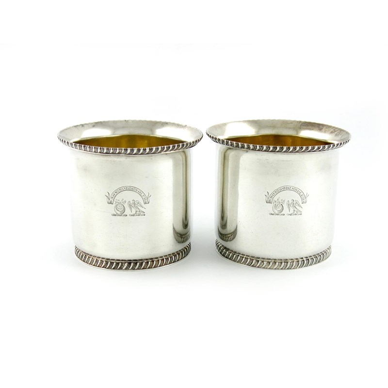 circular form, gadroon borders, gilded interiors, engraved with a crest and motto, height 10cm, approx. weight 19oz. (2)