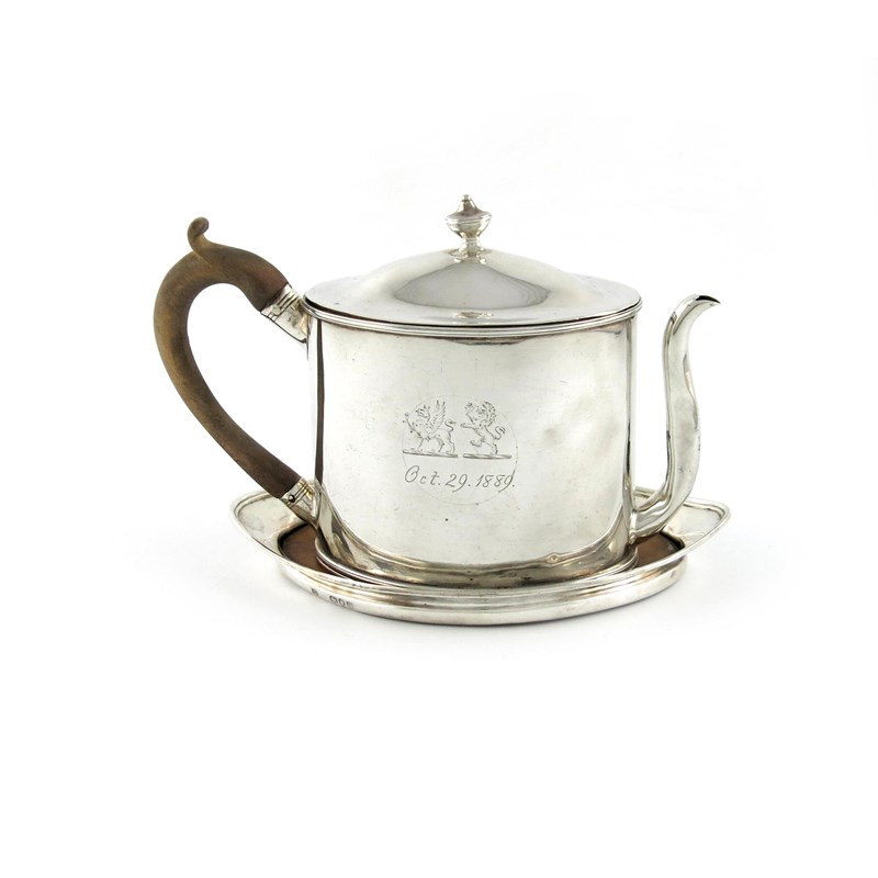 oval form, wooden scroll handle, pull-off cover with an urn finial, reeded borders, engraved with the Wynne Finch crests and dated Oct 29 1889, the reverse inscribed 'Ah