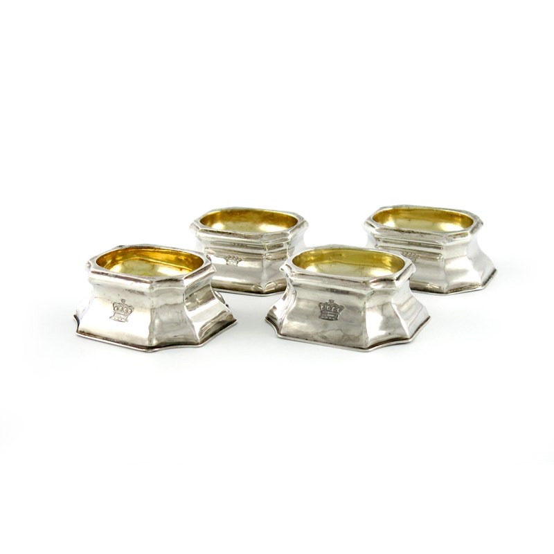 rectangular form, canted corners, gilded oval bowls, engraved with crests, length 7.4cm, approx. weight 6oz. (4)