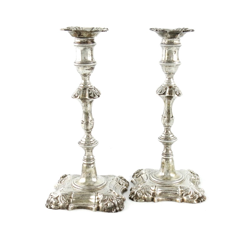 knopped stems with square shoulders, spool shaped capital, detachable drip pans, on raised shaped square bases with shell motifs, engraved with a crest, height 23cm, approx. weight 34oz. (2)