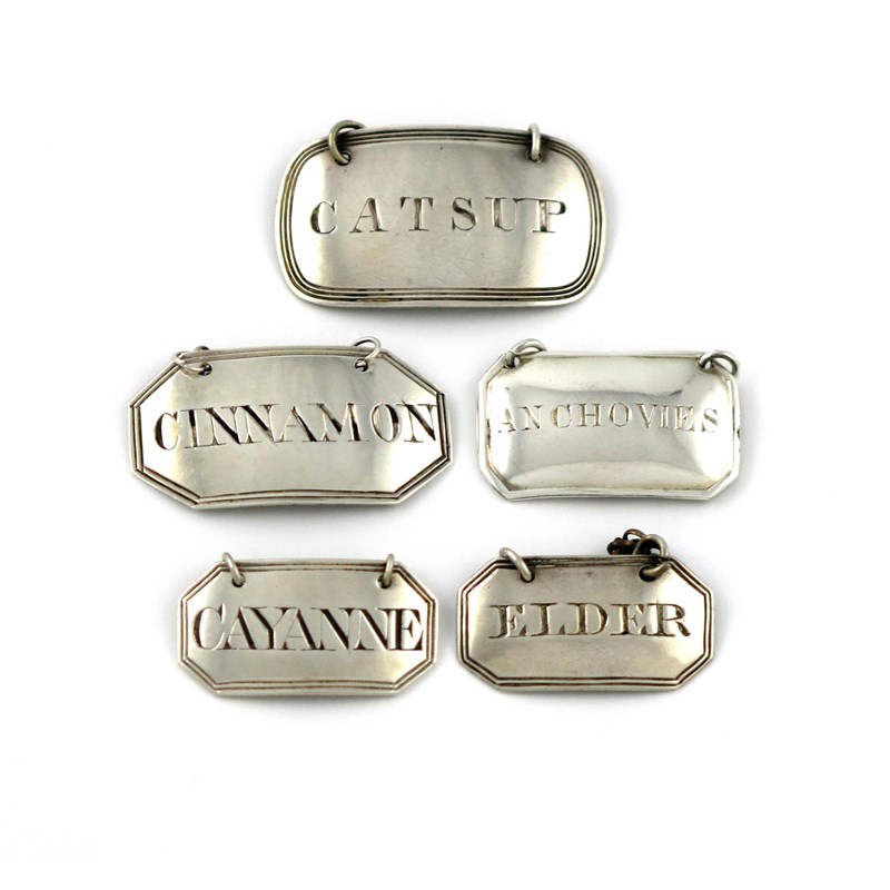 canted rectangular form, reeded borders, incised 'CATSUP', 'ANCHOVIES', 'CAYANNE', 'ELDER' and 'CINNAMON', approx. weight 0.9oz.