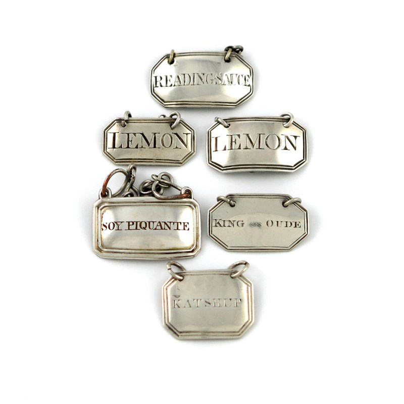 comprising: one by John Tongue, Birmingham 1856, incised 'KING OF OUDE', plus 'READING SAUCE', ' LEMON', (x2), 'KATSHUP' and an old Sheffield plated label 'SOY PIQUANTE', approx. weighable 0.4oz. (6)