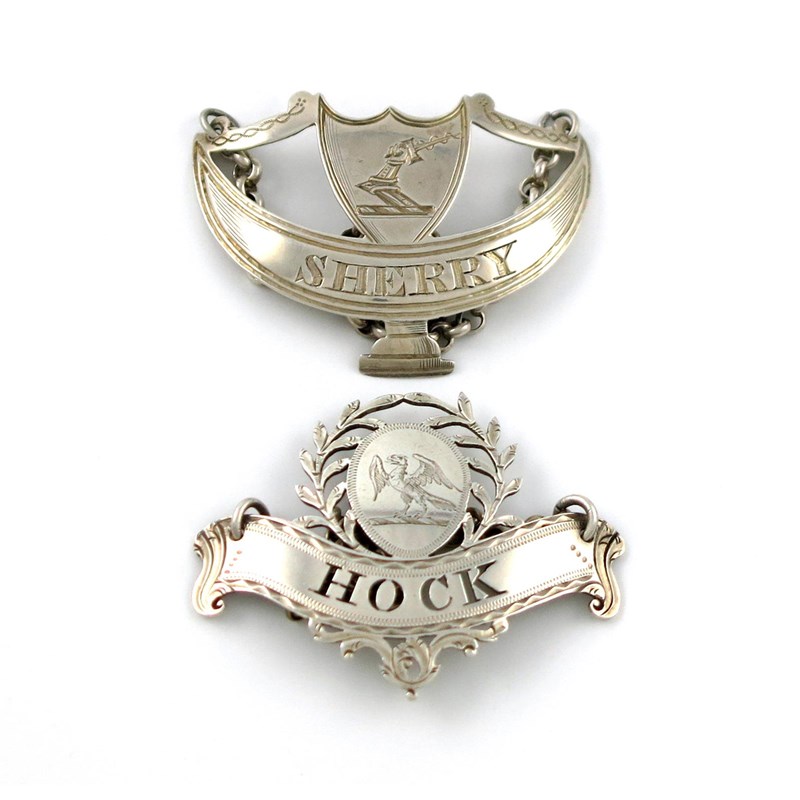scroll form, bright-cut border, with a pierced pediment engraved with a crest, pierced 'HOCK', length 4.7cm, plus a George III wine label, by Joseph Taylor, Birmingham 1802, crescent and goblet form, with a crested shield pediment, incised 'SHERRY', approx. weight 0.6oz. (2)