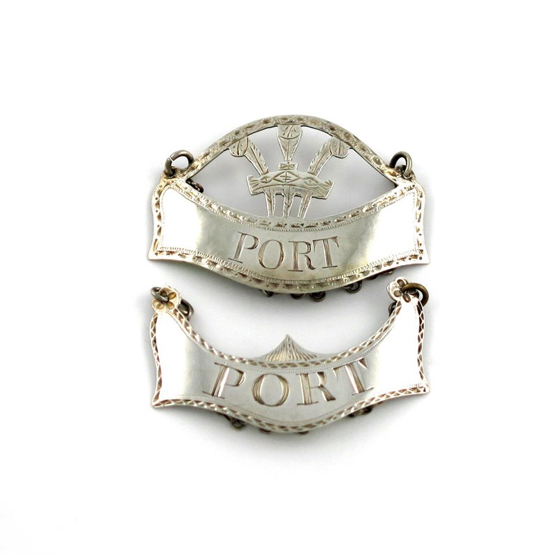 scroll form, bright-cut border, pierced with Prince of Wales feathers, incised 'PORT', plus a George III Irish label, by George Nangle, Dublin circa 1790, incised 'PORT', approx. weight 0.4oz. (2)