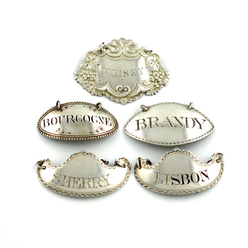 comprising a George III pair, by Crispin Fuller, London 1808, bright-cut borders, incised 'LISBON' and 'SHERRY', plus one incised 'BOURGOGNE', one WHISKY and one BRANDY, approx. weight 1.5oz. (5)