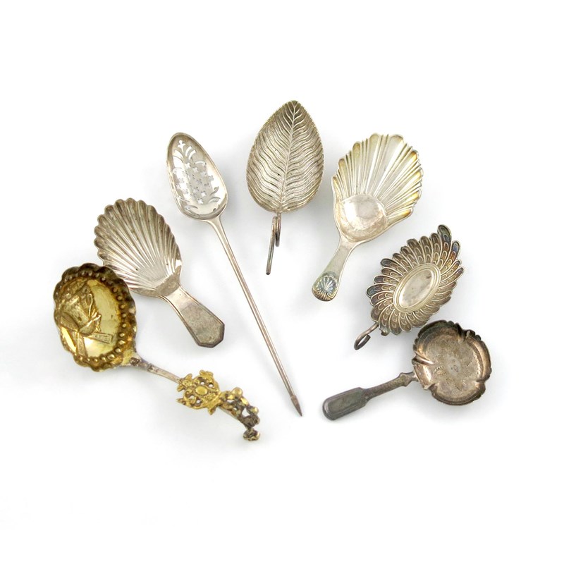 comprising: a mid 18th century mote spoon, the bowl pierced with mullets and scroll decoration, plus a George III caddy spoon of leaf form, by Matthew Linwood, Birmingham 1808, four further caddy spoons and a Dutch silver-gilt spoon, approx. weight 2.3oz. (7)