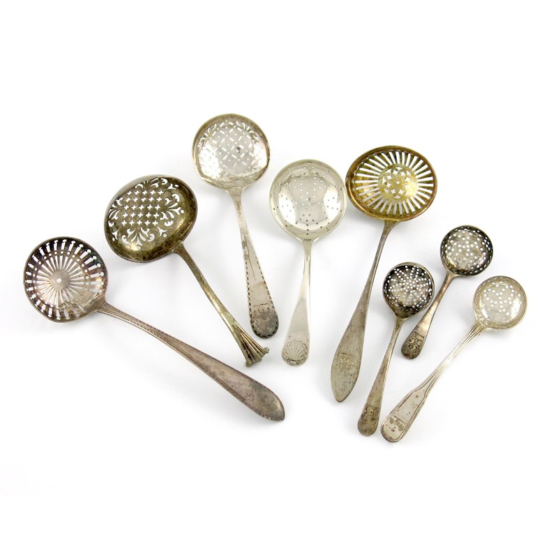 comprising: a Fiddle and Thread example, by Eley and Fearn, London 1806, an Irish one, an Onslow pattern one, a continental sifter and four others, approx. weight 7.5oz. (8)