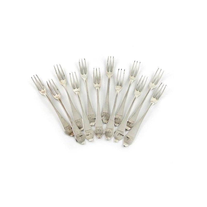 A matched set of twelve George II / III silver Dog-nose dessert forks