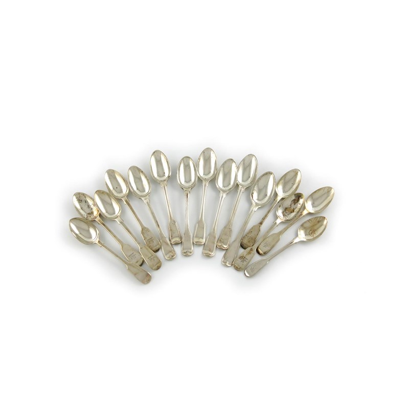 comprising: a set of six Victorian Fiddle pattern spoons, by George Adams, London 1828, the terminals with the Finch crest, plus seven English and Continental Fiddle and Thread pattern teaspoons and two Fiddle pattern teaspoons, approx. weight 12.5oz. (15)