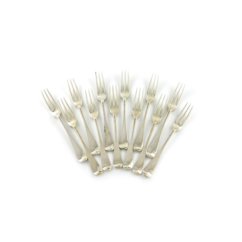 A set of twelve Victorian silver three-pronged Hanoverian pattern table forks
