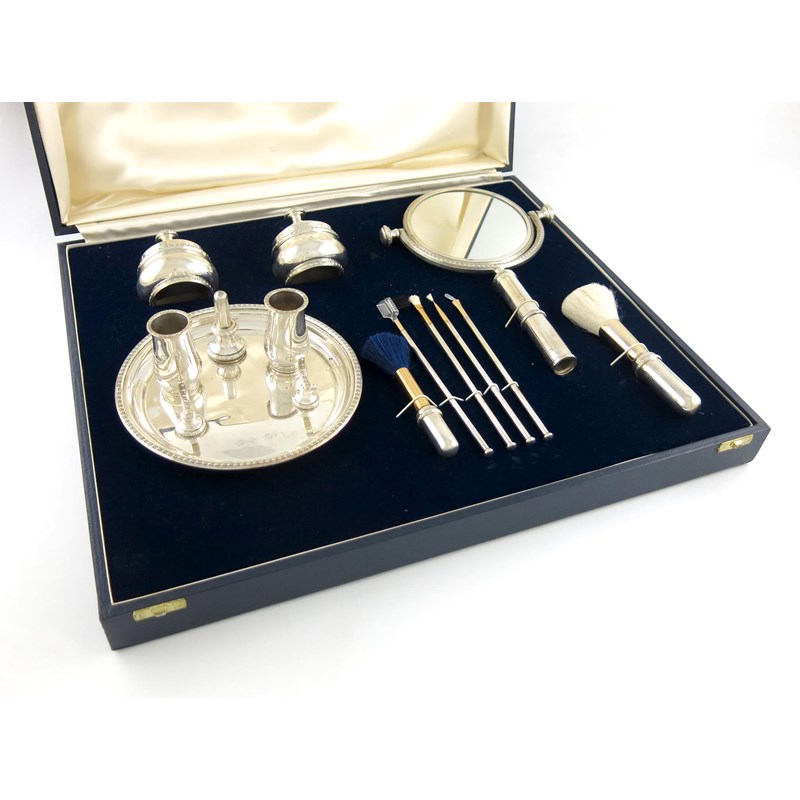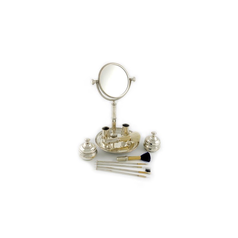 A modern silver dressing table make-up set