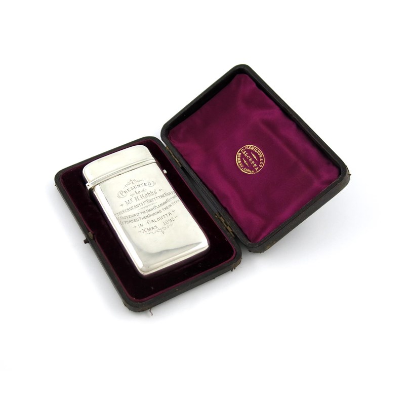 plain rectangular form, the front inscribed 'Presented to Mr. H. Hobbs, by the Sergeants 1st Battn. The Buffs, as a souvenir of the many pleasant evenings afforded them during their stay in Calcutta , Xmas 1892', in a fitted case, length 12cm, approx. weight 3oz.