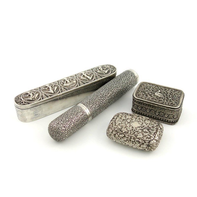 comprising: one by J. Manikrai, Karachi, rounded rectangular form, the cover chased with figures, plus a scroll case of cylindrical form, finely chased foliate decoration, a squeeze-action tobacco box and another box, chased with a bird and foliate scroll decoration, approx. weight 25oz. (4)